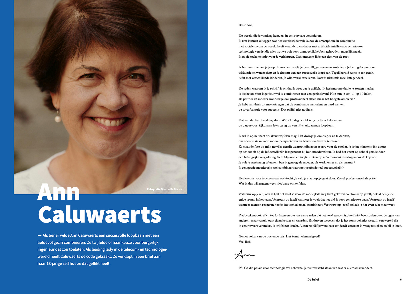 Onlangs kreeg ik van de fijne mensen van The Fat Lady de vraag of ik de pen van Ann Caluwaerts, leading lady in de telecom- en technologiewereld, wilde vasthouden. Zij zou in het Voka Magazine een brief schrijven aan een jongere versie van zichzelf.